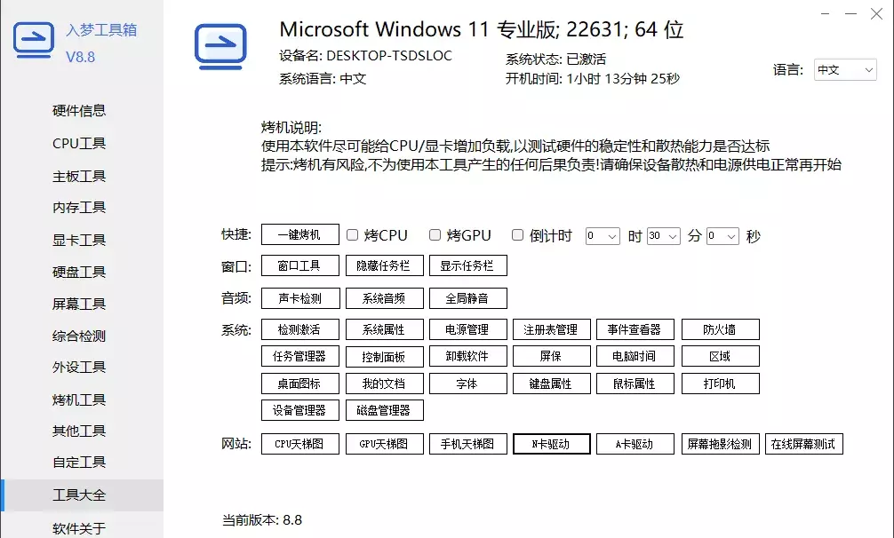 集成了数十款常用的硬件工具箱,包括常用的 CPUZ、GPUZ、AIDA64 等多款工具,还有非常多工具大全。